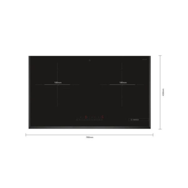 Bếp từ đôi Bosch PMI82560VN Không viền được trang bị 2 vùng nhiệt với đường kính mỗi vùng là 18 cm, cho phép nấu nhiều món ăn cùng lúc, tiết kiệm thời gian đáng kể.