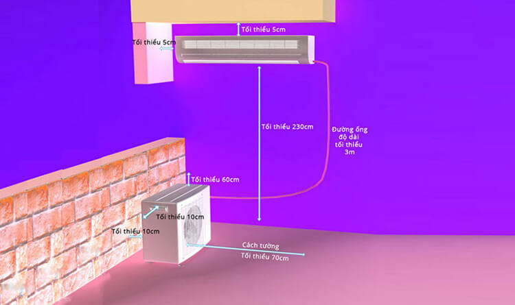 Không có quy định quá khắt khe về độ cao tối thiểu, tuy nhiên bạn vẫn nên duy trì một khoảng chênh nhất định để dễ dàng trong việc bố trí đường ống thoát nước ngưng của dàn lạnh.