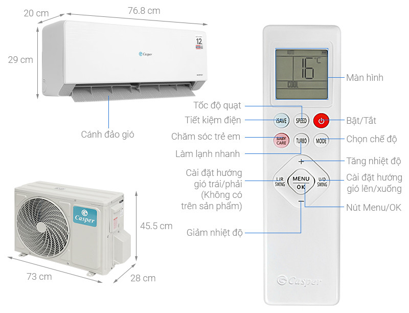 | Kích thước dàn nóng | Dài 73 cm - Cao 45.5 cm - Dày 28 cm |