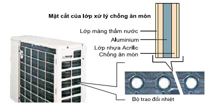 Dàn nóng của máy được xử lý chống ăn mòn với lớp phủ nhựa acrylic và lớp chống thấm nước đặc biệt. Nhờ đó, thiết bị có khả năng chống lại tác động của mưa axit, hơi muối và môi trường ẩm ướt, giúp tăng tuổi thọ và duy trì hiệu suất làm lạnh ổn định theo thời gian.