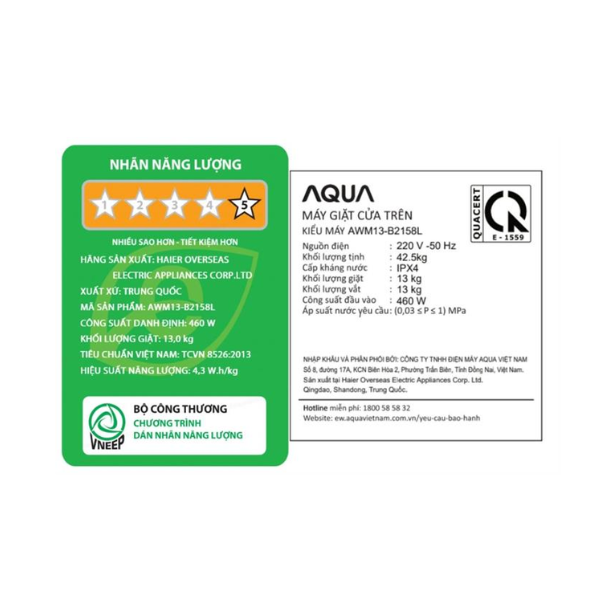 Với khối lượng giặt lên đến 13 kg, máy giặt Aqua Inverter AWM13-B2158L(B) phù hợp cho gia đình trên 7 thành viên hoặc những gia đình có nhu cầu giặt nhiều trong một lần.