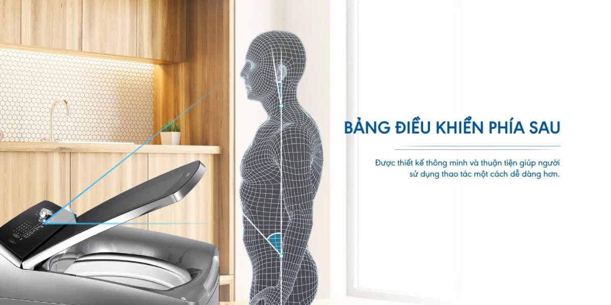 Bảng điều khiển dạng núm xoay, hiển thị tiếng Việt rõ ràng, được bố trí phía sau giúp người dùng thao tác thuận tiện mà không cần cúi thấp.
