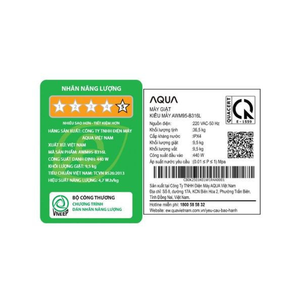 Với khối lượng giặt 9.5 kg, Aqua AWM95-B316L(B) đáp ứng tốt nhu cầu giặt giũ của gia đình khoảng 5 - 7 thành viên, phù hợp các nhà có nhiều quần áo, ga giường, chăn mỏng cần giặt thường xuyên.