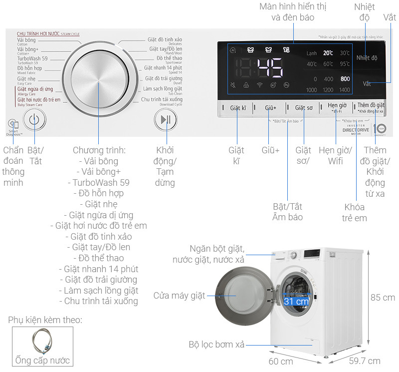 | Chương trình | Vải bông + Vải bông TurboWash 59 Đồ tinh xảo Đồ thể thao Đồ hỗn hợp Vệ sinh lồng giặt Giặt tay + đồ len Giặt nhẹ Giặt nhanh 14 phút Giặt ngừa dị ứng Giặt hơi nước đồ trẻ em Chu trình tải về Giặt ga giường |