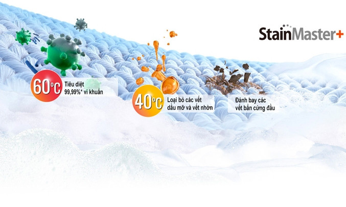 Máy tích hợp công nghệ StainMaster+, kết hợp nước nóng và xoáy nước mạnh giúp: