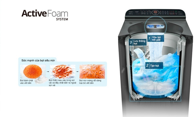Công nghệ Active Foam tạo ra lớp bọt siêu mịn ngay từ đầu chu trình giặt, giúp: