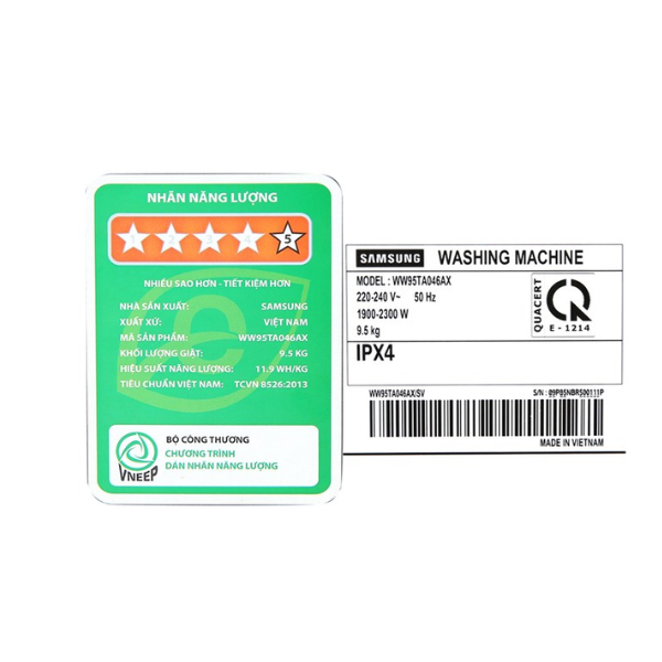 Máy giặt Samsung Inverter WW95TA046AX/SV 9.5kg là dòng máy giặt lồng ngang hiện đại, được trang bị nhiều công nghệ tiên tiến giúp nâng cao hiệu quả giặt sạch, tiết kiệm điện năng và bảo vệ sợi vải. Với khối lượng giặt lớn cùng đa dạng tiện ích thông minh, sản phẩm là lựa chọn phù hợp cho gia đình từ 5 đến 7 người.