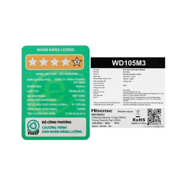 Máy giặt sấy Hisense Inverter giặt 10.5 kg - sấy 7 kg WD105M3 không chỉ đáp ứng nhu cầu giặt giũ hiệu quả mà còn mang đến sự tiện lợi với công nghệ giặt tiên tiến và nhiều tính năng thông minh tích hợp AI đưa ra đề xuất tối ưu khả năng giặt giũ đồng thời tiết kiệm điện và nước giặt.
