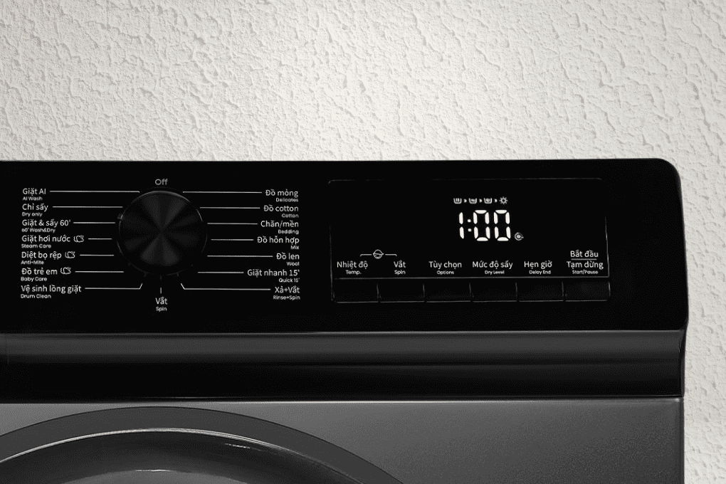 | Chương trình | Giặt AI Chỉ sấy Đồ trẻ em Đồ mỏng Đồ len Đồ hỗn hợp Đồ cotton Xả + vắt Vệ sinh lồng giặt Vắt Giặt sấy 60 phút Giặt nhanh 15 phút Giặt hơi nước Chăn mền Diệt bọ rệp |
