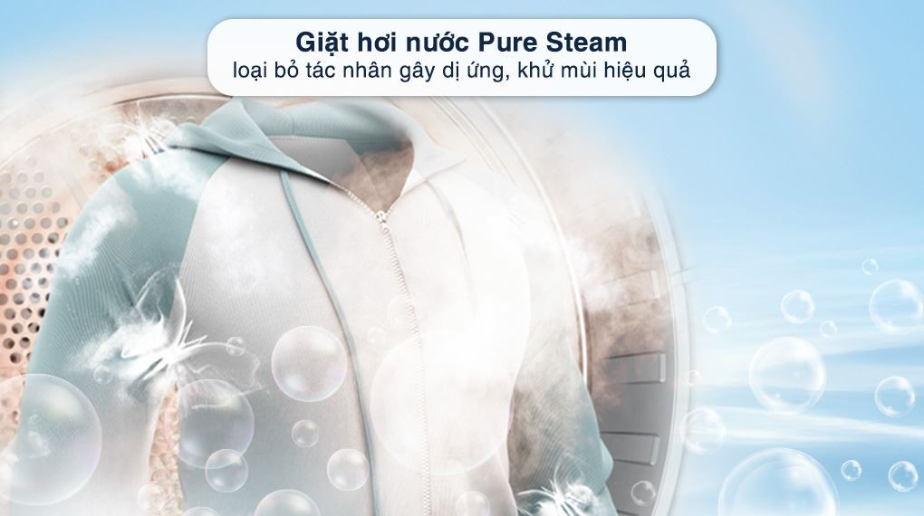 Đáng chú ý là chế độ Giặt hơi nước Pure Steam, hỗ trợ diệt khuẩn và khử mùi, rất phù hợp cho nhà có trẻ nhỏ, người cao tuổi hoặc những ai có làn da nhạy cảm. Chương trình Giặt & Sấy 60 phút lại thích hợp với quần áo mặc trong vài tiếng, ít bám bẩn ở những nơi khó vệ sinh như cổ áo và tay áo, các món đồ cần làm sạch và sấy khô nhanh để sử dụng trong ngày.