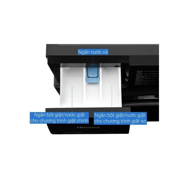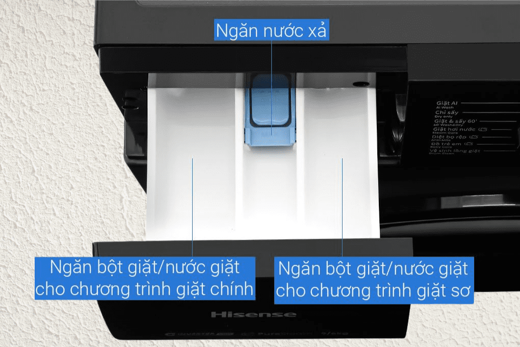 Hộc chứa chất tẩy rửa được chia làm ba ngăn riêng, giữ cho hương không bị trộn lẫn mùi và phát huy đúng công dụng từng loại. Ngăn lớn bên trái dùng cho bột giặt hoặc nước giặt của chu trình chính, tăng hiệu quả làm sạch. Ngăn nhỏ màu xanh ở giữa chứa nước xả, giúp làm mềm vải và lưu hương thơm.