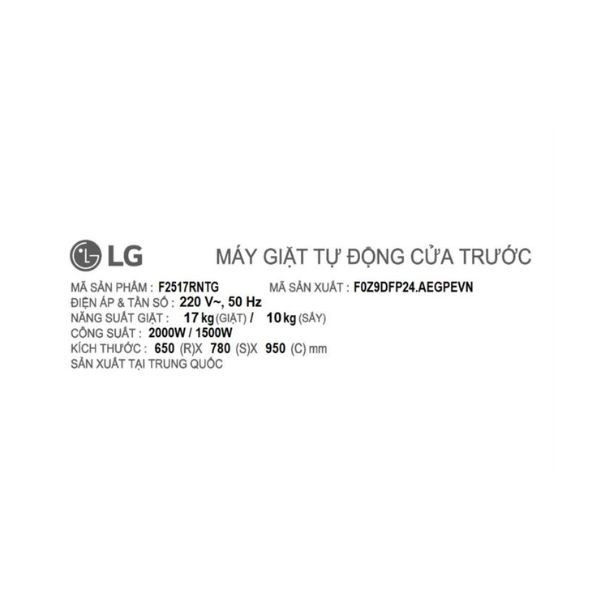 Máy giặt sấy LG Inverter giặt 17 kg - sấy 10 kg F2517RNTG là lựa chọn lý tưởng cho những ai cần một thiết bị giặt sấy dung tích lớn, tích hợp công nghệ thông minh và nhiều tiện ích hữu dụng. Không chỉ mang lại hiệu quả giặt sạch – sấy khô tối ưu, máy còn giúp người dùng tiết kiệm thời gian, điện năng và công sức trong mỗi lần giặt. Với thiết kế hiện đại, vận hành êm ái và khả năng điều khiển linh hoạt, đây là sản phẩm xứng đáng đồng hành cùng gia đình trong hành trình chăm sóc quần áo tiện nghi và hiện đại.