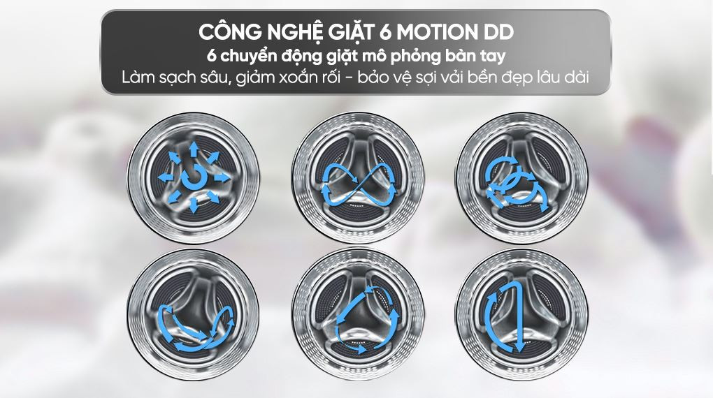 Công nghệ giặt 6 Motion DD mô phỏng các chuyển động giặt tay, giúp quần áo được làm sạch nhẹ nhàng, hạn chế xoắn rối và giữ cho sợi vải bền đẹp hơn.