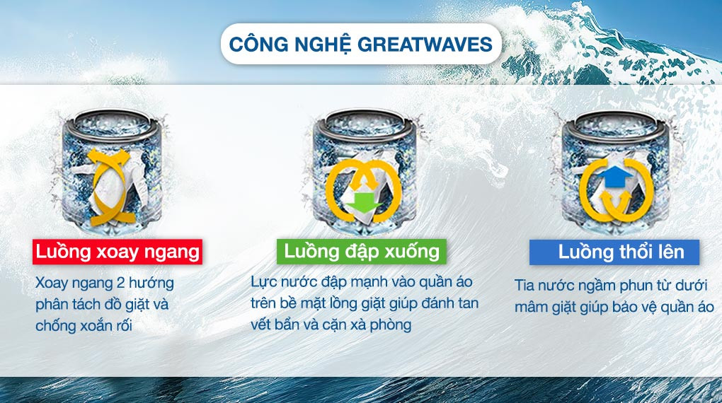 - Công nghệ Greatwaves: với sự kết hợp 3 luồng nước cùng các tia nước tạo ra từ lỗ phun của máy giặt Toshiba, thiết bị kiến tạo luồng nước siêu mạnh giúp phân tách quần áo, chống xoắn rối, loại bỏ vết bẩn, cặn xà phòng, giúp giặt sạch và bảo vệ chất liệu vải.