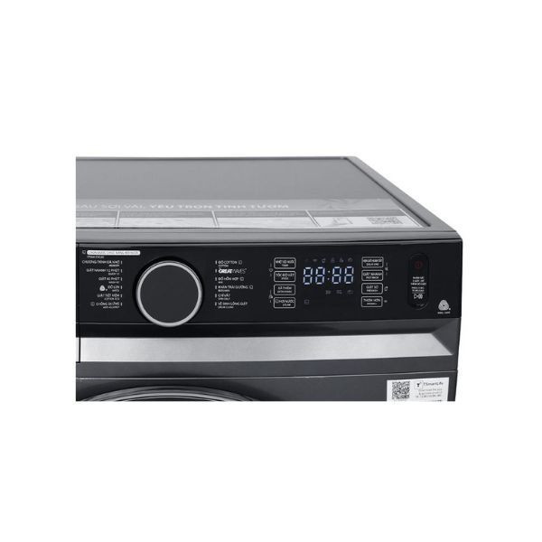 - Máy giặt có thiết kế cửa trước sang trọng, với bẳng điều khiển núm xoay, cảm ứng và màn hình hiển thị rõ ràng, hỗ trợ song ngữ Anh-Việt sễ thao tác.