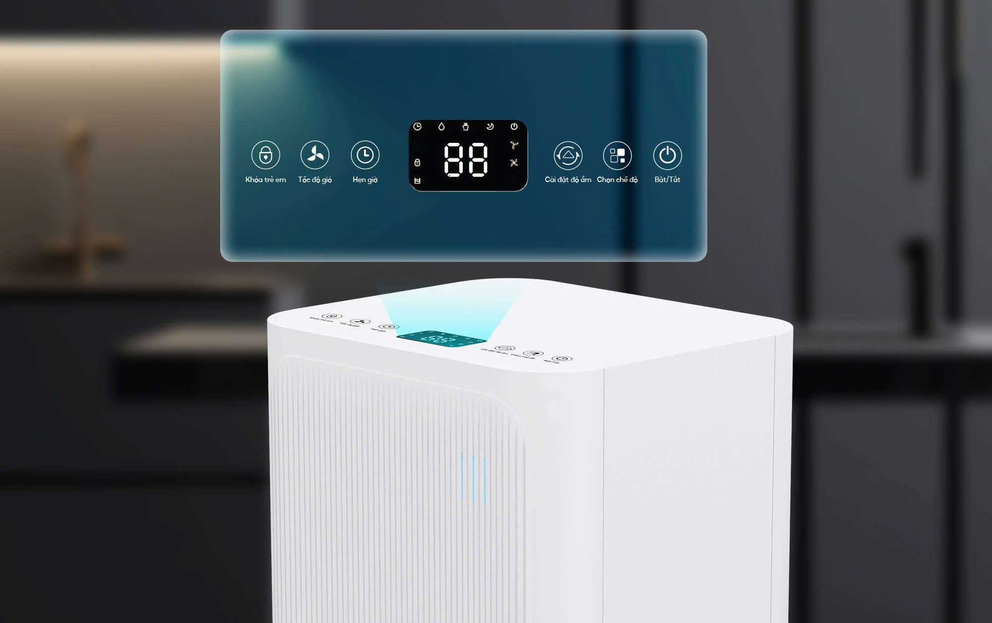 Màn hình hiển thị độ ẩm rõ nét đặt ở mặt trên, giúp người dùng dễ dàng quan sát và tuỳ chỉnh mức độ ẩm theo nhu cầu sử dụng.