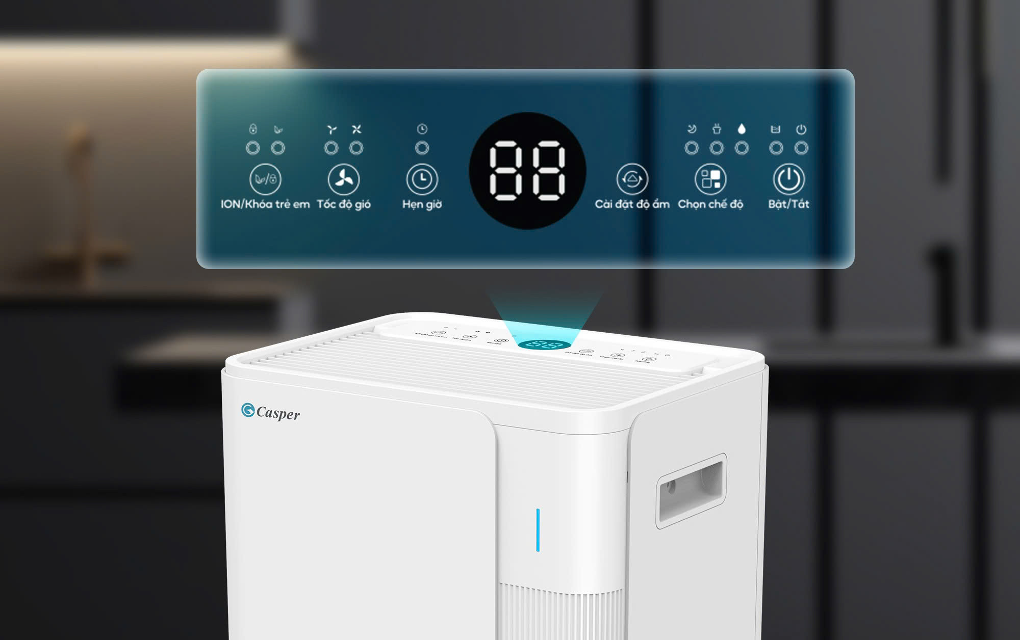 Thiết kế màu trắng trang nhã, dễ dàng hài hòa với nhiều phong cách không gian sống. Đồng thời, đèn báo độ ẩm 3 màu giúp người dùng nhanh chóng nhận biết và theo dõi độ ẩm thực tế một cách trực quan, tiện lợi.