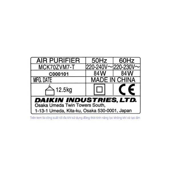 Thông số kỹ thuật: Máy lọc không khí tạo ẩm Daikin MCK70ZVM7-T 82W