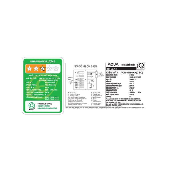 | Công suất tiêu thụ công bố theo TCVN | 503.1 kWh/năm |