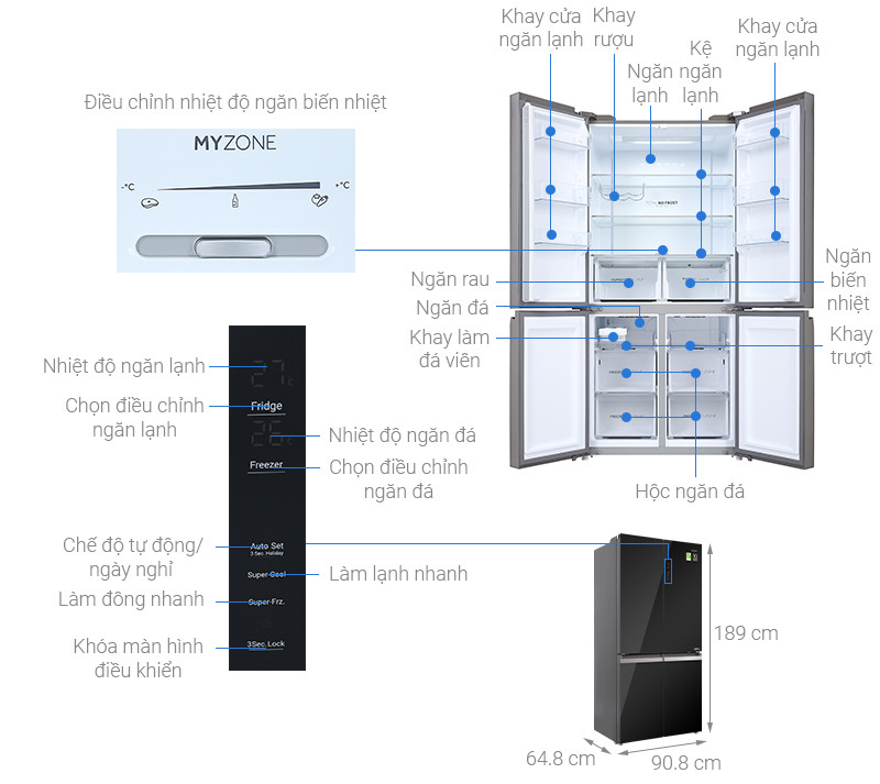 | Công nghệ bảo quản thực phẩm | Ngăn rau củ giữ ẩm Humidity Zone Ngăn biến nhiệt tùy chỉnh nhiệt độ và độ ẩm Công nghệ cân bằng độ ẩm HCS |