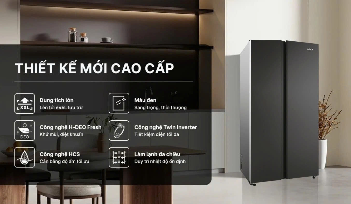 Tủ lạnh Aqua Inverter 646 lít AQR-S682XA(BL) sở hữu tông màu Đen thời thượng, thanh lịch. Kết hợp thiết kế tối giản nhưng hết mực sang trọng nên chúng phù hợp với mọi loại nội thất, tăng thẩm mỹ cho không gian bếp của gia chủ. Bề mặt cửa được hoàn thiện bằng chất liệu Thép cao cấp giúp duy trì độ bền, hạn chế trầy xước, tăng hiệu quả giữ mát, giảm điện năng tiêu thụ.