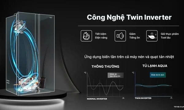 Tủ lạnh Aqua trang bị công nghệ Twin Inverter được ứng dụng trên cả máy nén lẫn dàn tản nhiệt giúp nâng cao hiệu quả tiết kiệm điện hơn rất nhiều so với công nghệ Inverter thường. Vì thế, tủ chỉ tiêu tốn khoảng 1.71kW/ngày.