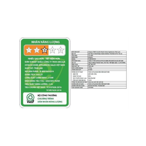 | Công suất tiêu thụ công bố theo TCVN | 606 kWh/năm |