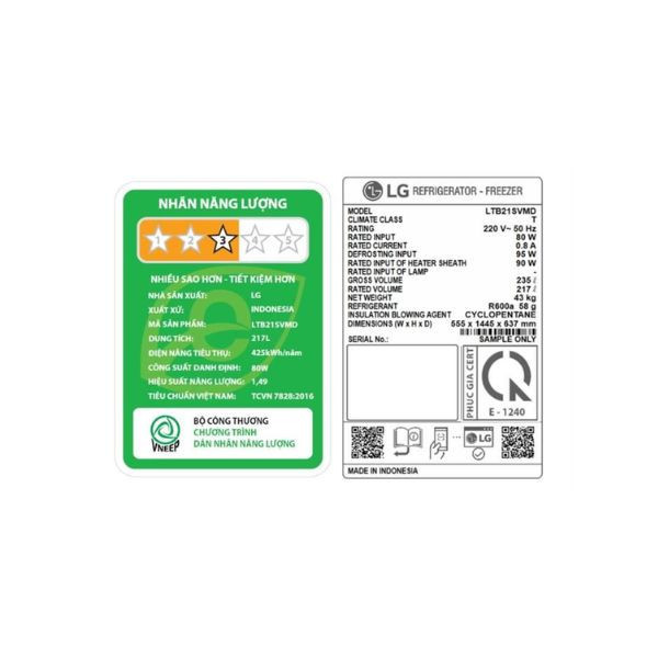 | Công suất tiêu thụ công bố theo TCVN | 425 kWh/năm |