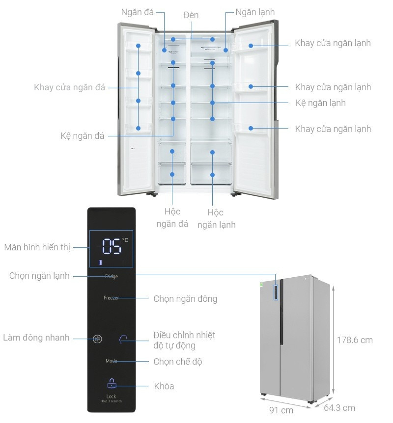 - Dòng tủ lạnh side by side, chất liệu cửa tủ được làm từ thép không gỉ bền chắc với màu bạc tinh tế, hòa hợp với mọi không gian nội thất.