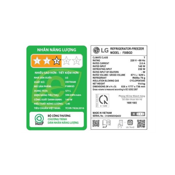 | Dung tích sử dung | 571 lít - Trên 5 người |