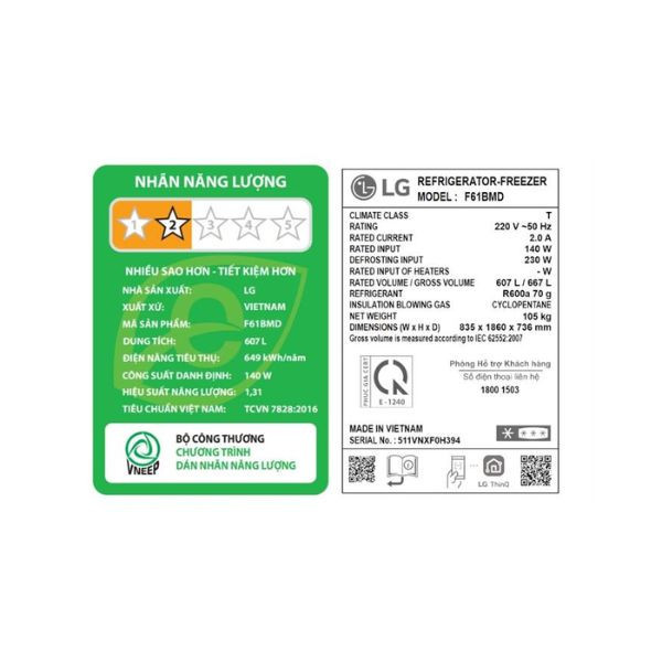 | Dung tích sử dung | 607 lít - Trên 5 người |