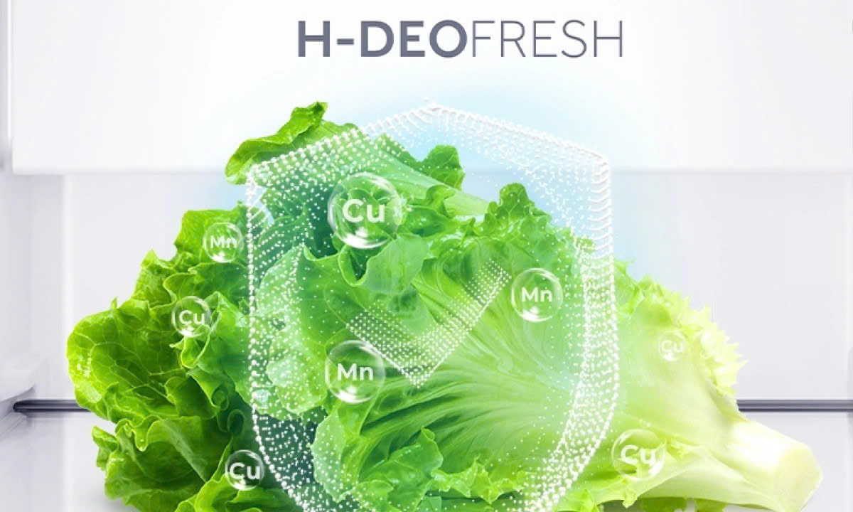 Công nghệ H-DEO Fresh tích hợp trong tủ lạnh Aqua AQR-M570XA(FS) hỗ trợ khử mùi hiệu quả, giảm thiểu vi khuẩn phát sinh, giữ cho không gian bảo quản thực phẩm luôn sạch sẽ và dễ chịu.